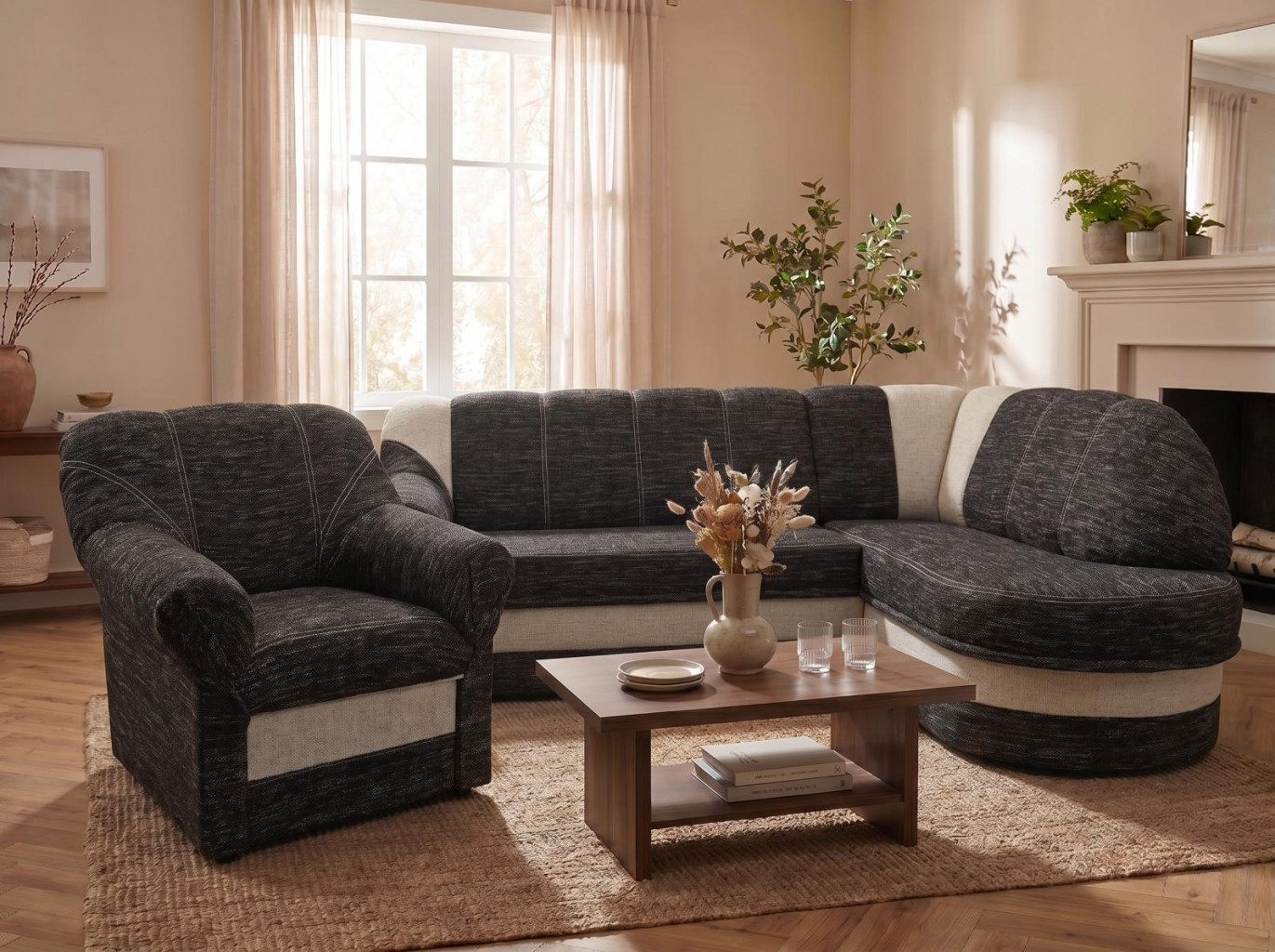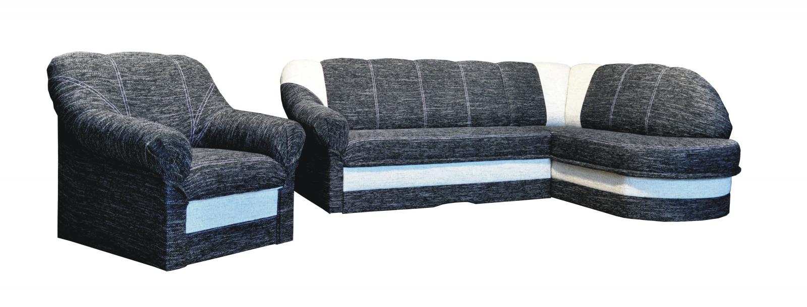 Dotaz na produkt Na splátky ještě dnesVelmi praktický set rohové sedací soupravy a křesla Sandra je vhodný do menších prostor. Pohodlné sezení zaručují pružiny bonel s PUR pěnou. Jednoduchým rozkladem sedací soupravy vznikne lůžko 190x125 cm vhodné k příležitostnému spaní. Sedací souprava má praktický úložný prostor na lůžkoviny. Celkový rozměr sedací soupravy je 240x185 cm.