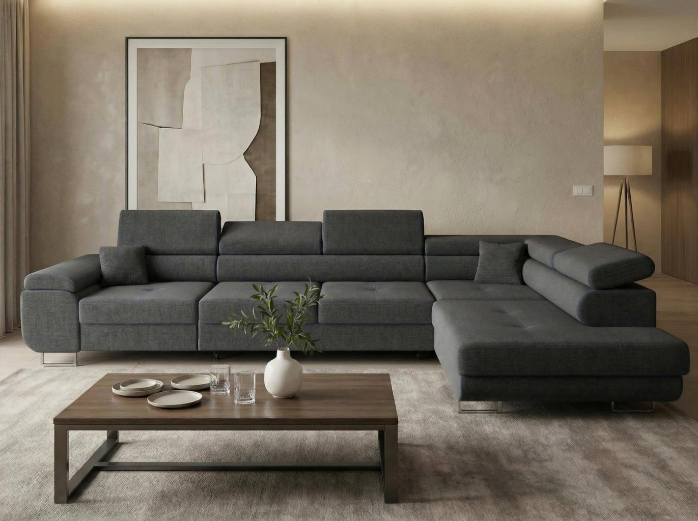 Sedací soupravu nabízíme v levém i pravém provedení. Vyobrazené doplňky a dekorace nejsou v ceně.