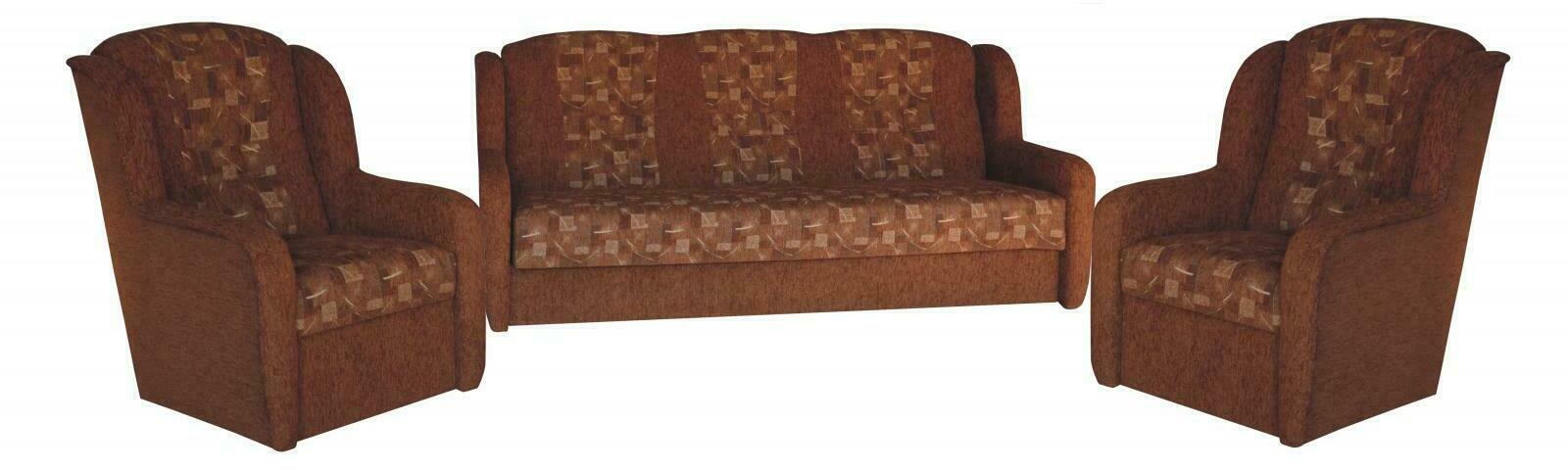 Ušák je stále velmi oblíbeným klasickým modelem sedací soupravy v provedení 3F+1+1. Je velmi pohodlná a zároveň praktická. Sedací souprava je rozkládací a samozřejmostí je i úložný prostor. Jednoduchým rozkladem pomocí systému "klik klak" vznikne lůžko k příležitostnému přespání Vaší návštěvy. Sedací souprava je potažena kvalitní látkou a nabízíme ji v několika barvách, ze kterých si určitě vyberete tu nejvhodnější pro Váš obývací pokoj. Výpň sedáků tvoří pružiny v kombinaci s kvalitní PUR pěnou. Tato kombinace zajistí velmi pohodlné sezení. Cena sedací soupravy je uvedena za rozkládací trojsed a dvě křesla.