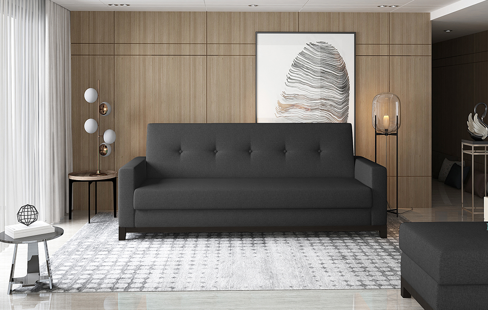 Dotaz na produkt Na splátky ještě dnesSelene je prostorná, klasická pohovka o rozměrech 216 x 87 x 93 cm, která je vytvořena mimořádně stylovým, ale minimalistickým způsobem. Je ideální pro lenošení ve dne i v noci, protože po rozložení pomocí mechanismu click-clack může mít podobu postele o rozměrech 195 x 110 cm. Pohovka má také prostorný úložný prostor na ložní prádlo, který se nachází v nábytkovém boxu. Pokud jde o výjimečnou flexibilitu a měkkost, je třeba zde zmínit pěnu T30, která je odolná vůči nevzhledným promáčknutím. Mezi další výhody tohoto modelu patří: stylové prošívání na opěradle a po stranách nábytku, dřevěné nohy z masivního dřeva, tvarované opěradlo a také dostupnost modelu v mnoha barevných variantách. Selene je výjimečným kusem nábytku na mnoho let. Pokud vám záleží na maximálním pohodlí v kombinaci s funkčností - Selene bude jistě hitem! Látky: Sawana 14