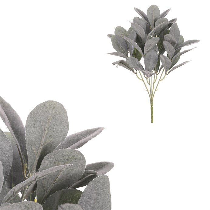 Dotaz na produktUmělá dekorace v podobě trsu s okrouhlými lístky v zeleno-šedé barvě. Tato univerzální rostlinná přízdoba je perfektní pro oživení vašeho interiéru. Můžete ji použít samostatně ve váze, jako součást větších aranží, nebo ji zakomponovat do věnců a dalších dekorací. Přináší do vašeho domova přirozený vzhled a nikdy neuvadne.