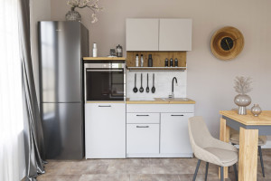 Kuchyňská linka 160 kombinuje moderní design s praktickým uspořádáním. Její závěsná skříňka s odkapávačem umožňuje efektivní sušení nádobí, zatímco skříňka s pracovní deskou poskytuje prostor pro přípravu jídla a uskladnění věcí. Multifunkční skříňka nabízí prostor pro mikrovlnku nebo troubu, což přidává další úroveň praktičnosti a pohodlí. Pro větší pohodlí a styl je součástí LED podsvícení.