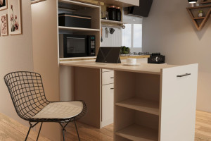 • Multifunkční skříňka s výsuvným stolem, kterou lze využít na mikrovlnku nebo troubu