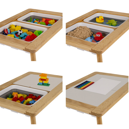 - všestrannost a pohodlí – oboustranná deska stolu a dvě vyjímatelné nádoby Stůl lze použít jako pískoviště, vodní stůl nebo na kreslení , snadno čistitelné prvky zajišťují rychlé čištění po každé hře