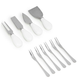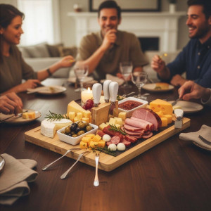 Dotaz na produktServírovací prkénko z bambus nabízí kombinaci přírodního dřeva a kamenné desky pro atraktivní podávání sýrů, uzenin i drobného občerstvení. Praktické uspořádání zahrnuje magnetický držák nožů, dvě misky, tři nože na sýr, jednu vidličku na sýr a šest malých vidliček. Ideální volba pro stylové servírování při rodinných oslavách i posezení s přáteli.