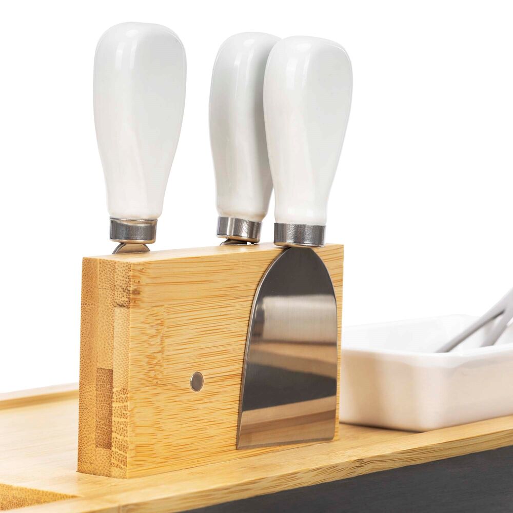 Servírovací prkénko z bambus nabízí kombinaci přírodního dřeva a kamenné desky pro atraktivní podávání sýrů, uzenin i drobného občerstvení. Praktické uspořádání zahrnuje magnetický držák nožů, dvě misky, tři nože na sýr, jednu vidličku na sýr a šest malých vidliček. Ideální volba pro stylové servírování při rodinných oslavách i posezení s přáteli.