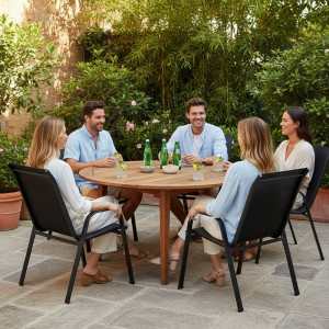 Pohodlné venkovní židle s vysokým opěradlem a širokými područkami zajistí komfort při sezení. Textilní podsedák je prodyšný a neabsorbuje vlhkost, ideální pro každé počasí. Díky stohovatelnosti snadno ušetříte místo. Kvalitní zpracování, antikorozní lakování a zaoblené hrany zaručují dlouhou životnost. Nosnost 120 kg.