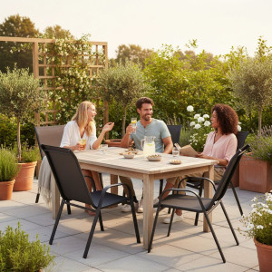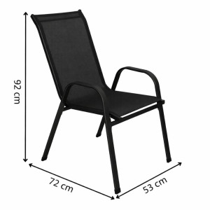 Pohodlné venkovní židle s vysokým opěradlem a širokými područkami zajistí komfort při sezení. Textilní podsedák je prodyšný a neabsorbuje vlhkost, ideální pro každé počasí. Díky stohovatelnosti snadno ušetříte místo. Kvalitní zpracování, antikorozní lakování a zaoblené hrany zaručují dlouhou životnost. Nosnost 120 kg.