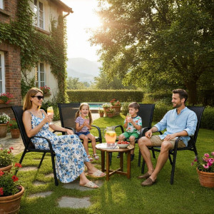 Set 4x zahradní židle SPRINGOS MONZA GF0071H v elegantní černé barvě je ideální volbou pro balkon, terasu i zahradu. Tyto židle zaujmou vysokým opěradlem a širokými područkami, které zajišťují maximální pohodlí při sezení. Textilní podsedák je navržen tak, aby byl prodyšný a neabsorboval vlhkost, což z něj dělá perfektní řešení pro venkovní použití.