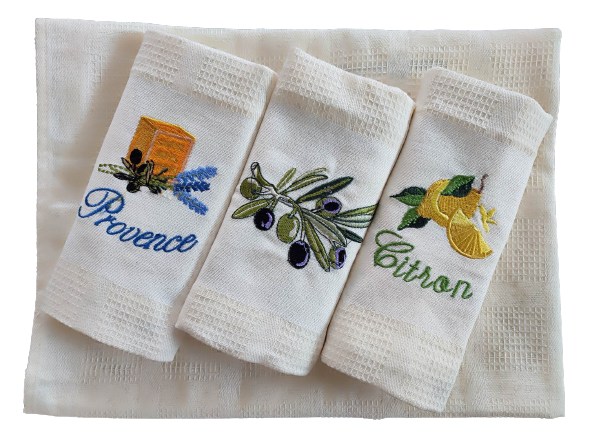 Každá z utěrek má jiné, atraktivní jednostranné vyšívání.