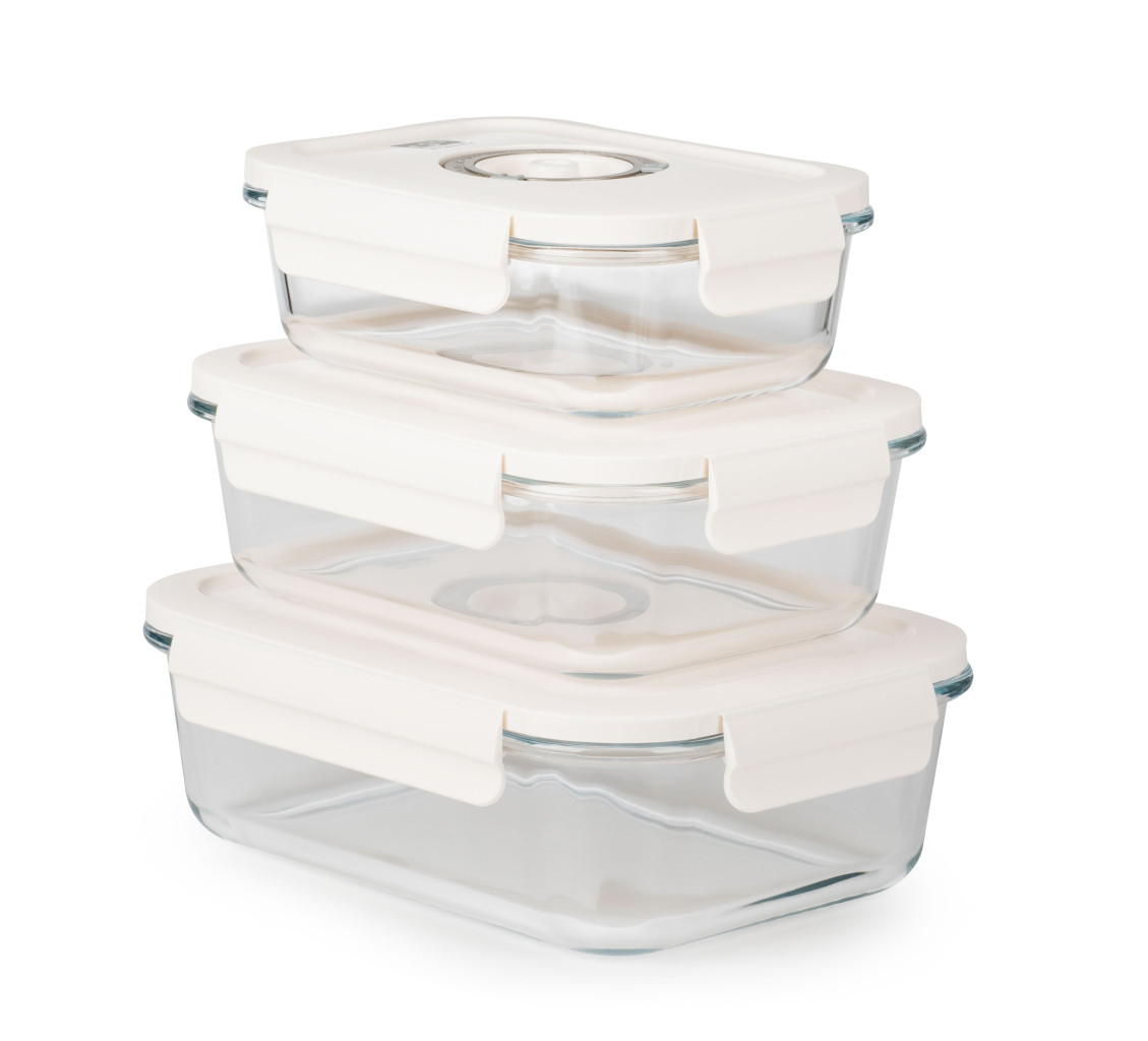 Plastová víka dóz jsou vybavena vakuovacím ventilem a praktickým nastavováním data. Budete tak vědět, kdy byly potraviny vakuovány nebo do kdy se mají spotřebovat. Ventil uprostřed víka lze jemně zmáčknout pro snadné uvolnění vakua.