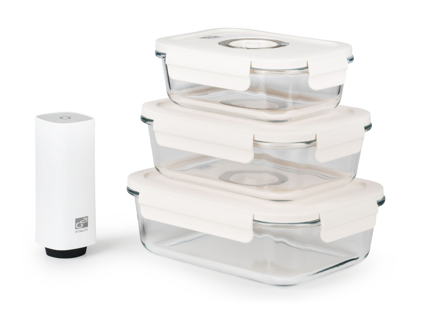 Dotaz na produktChcete, aby vaše potraviny zůstaly déle čerstvé, chutné a plné živin? Pořiďte si set G21 vakuovacích dóz s vakuovací pumpou! Tento praktický set obsahuje tři dózy různých objemů a vakuovací pumpu, se kterou snadno a rychle vytvoříte ve svých dózách vakuum. Tak prodloužíte čerstvost a trvanlivost potravin a zachováte jejich vůni, chuť i výživové hodnoty.