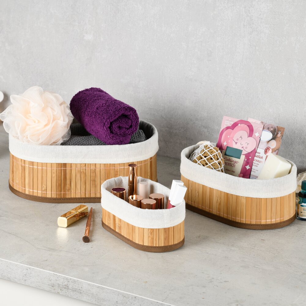 Sada tří stylových úložných košíků značky Kesper je praktickým a dekorativním řešením pro organizaci domácnosti. Košíky jsou vyrobeny z FSC® certifikovaného bambusu a doplněny textilními vložkami, které chrání obsah a dodávají elegantní vzhled. Různé velikosti umožňují variabilní využití v kuchyni, koupelně i obývacím pokoji. Bambusové košíky jsou lehké, odolné a snadno se udržují.
