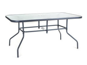 Sada zahradního nábytku TRENTON obsahuje 6 ks stohovatelných židlí a obdelníkový ocelový stůl se skleněnou deskou, který je opatřený otvorem pro instalaci slunečníku.