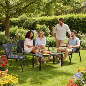 Celý set je postaven na stabilní kovové konstrukci, která zajišťuje dlouhou životnost a vysokou odolnost vůči vodě a povětrnostním vlivům. I při nepříznivém počasí si zachovává svůj elegantní vzhled a funkčnost. Stohovatelné židle navíc umožňují úsporné skladování, když nábytek právě nepoužíváte.