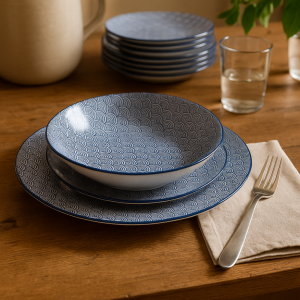 Elegantní jídelní sada 18 dílů z kvalitního porcelánu s jemným japonským motivem v modré barvě.
