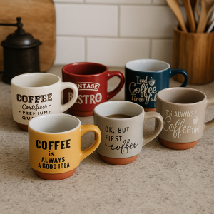 Dotaz na produktSada 6 kameninových hrnků s různými kávovými motivy.