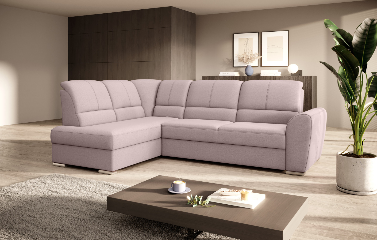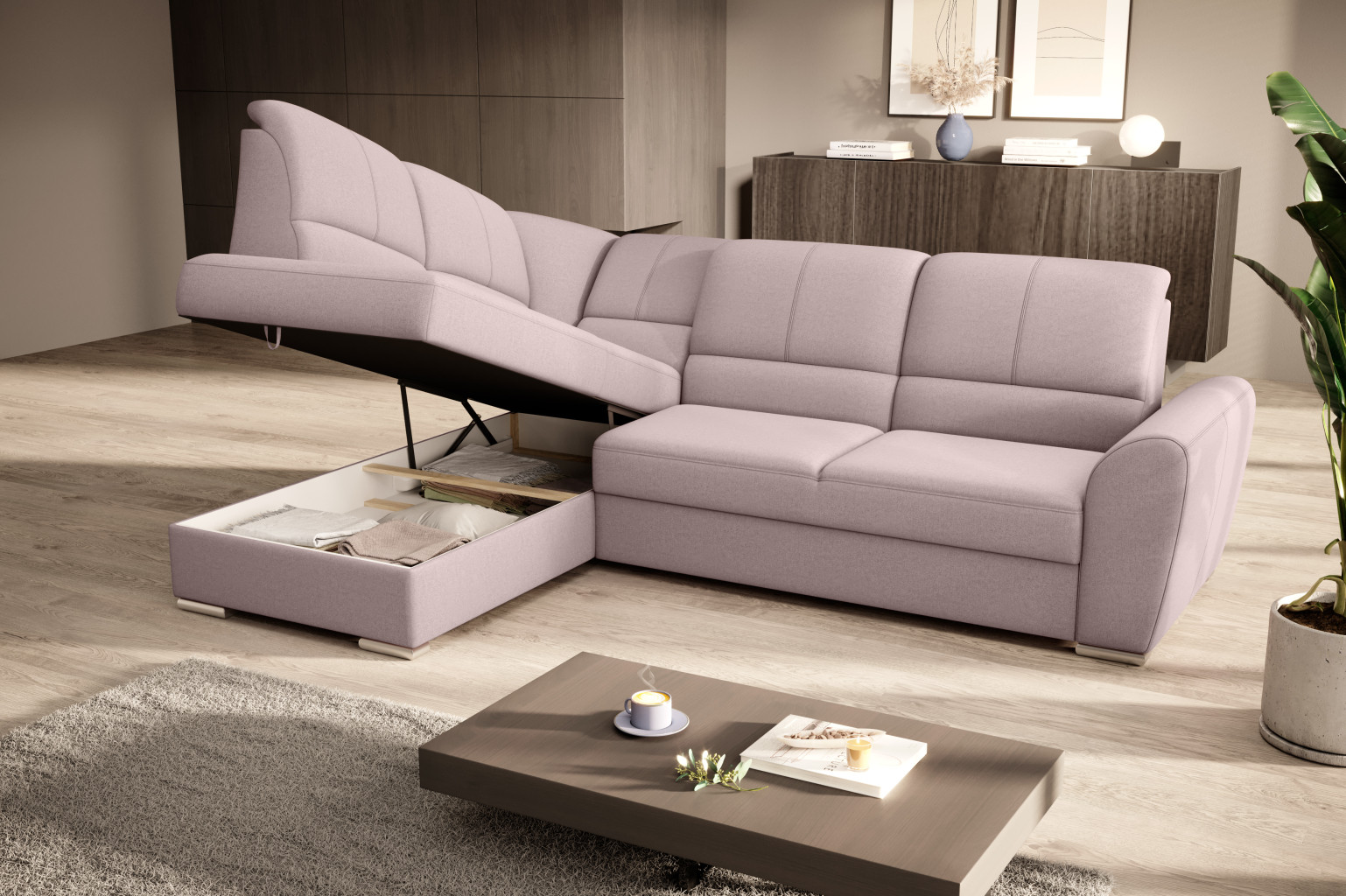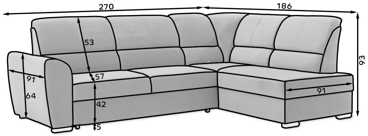 Dotaz na produkt Na splátky ještě dnesRohová pohovka Siber je perfektním řešením pro lidi, kteří si cení pořádku a organizace. Díky velkému prostoru na ložní prádlo pomáhá šetřit místo. Její vysoce profilovaná nastavitelná opěradla zdobená stylovým prošíváním promění i hodiny relaxace s vaším oblíbeným televizním seriálem v pohodlný a příjemný zážitek. Rozměry rohové pohovky: 270 x 186 x 93 cm, což umožňuje klidný odpočinek pro větší počet osob bez nutnosti přidávat další sedací soupravu. Rohová pohovka se navíc může stát dalším lůžkem díky funkci skládacího spaní s plochou 205 x 125 cm. Skládací mechanismus delfín použitý v tomto kusu nábytku je skvělý a jednoduchý způsob, jak proměnit rohovou pohovku v plnohodnotnou postel. Za zmínku stojí také nastavitelná opěradla, která vám pomohou pohodlně relaxovat při čtení knihy nebo sledování televize. Zajímavými prvky tohoto kusu nábytku jsou jeho 5 cm vysoké dřevěné nohy a sedák vyplněný pěnou T30, která poskytuje vynikající elasticitu a vysokou hustotu. Látky: Gojo 101