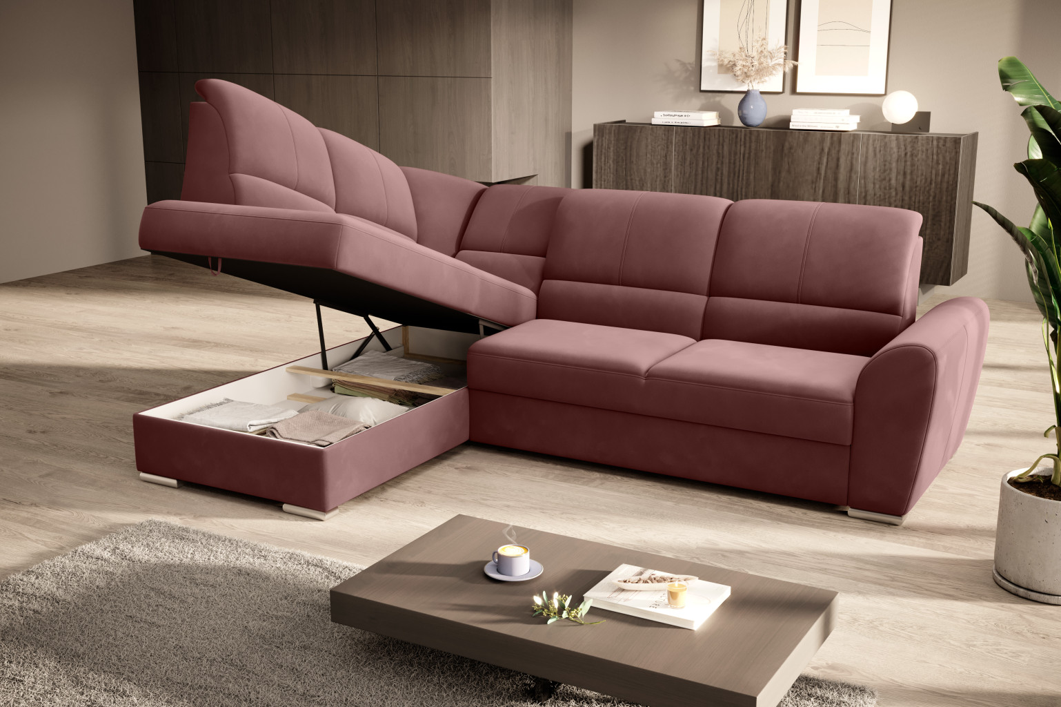 Dotaz na produkt Na splátky ještě dnesRohová pohovka Siber je perfektním řešením pro lidi, kteří si cení pořádku a organizace. Díky velkému prostoru na ložní prádlo pomáhá šetřit místo. Její vysoce profilovaná nastavitelná opěradla zdobená stylovým prošíváním promění i hodiny relaxace s vaším oblíbeným televizním seriálem v pohodlný a příjemný zážitek. Rozměry rohové pohovky: 270 x 186 x 93 cm, což umožňuje klidný odpočinek pro větší počet osob bez nutnosti přidávat další sedací soupravu. Rohová pohovka se navíc může stát dalším lůžkem díky funkci skládacího spaní s plochou 205 x 125 cm. Skládací mechanismus delfín použitý v tomto kusu nábytku je skvělý a jednoduchý způsob, jak proměnit rohovou pohovku v plnohodnotnou postel. Za zmínku stojí také nastavitelná opěradla, která vám pomohou pohodlně relaxovat při čtení knihy nebo sledování televize. Zajímavými prvky tohoto kusu nábytku jsou jeho 5 cm vysoké dřevěné nohy a sedák vyplněný pěnou T30, která poskytuje vynikající elasticitu a vysokou hustotu. Látky: Lukso 24