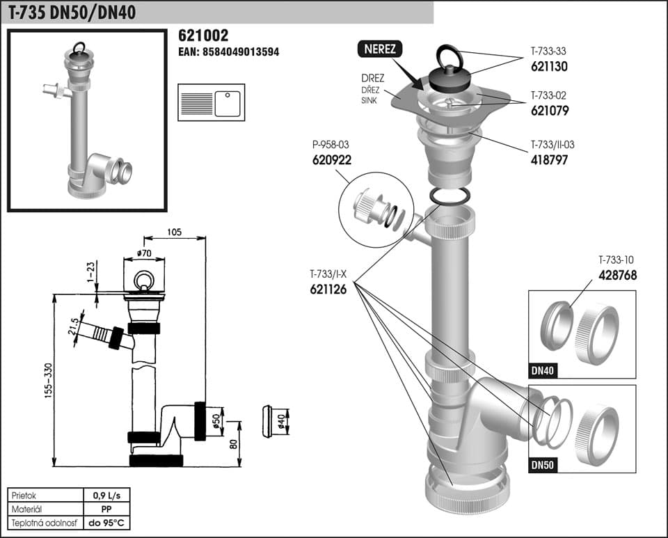 Dotaz na produktSifon dřezový s výpustí a přípojkou T-735 ND50/40