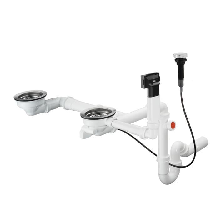 Koš na sítko z vysoce kvalitního pochromovaného kovu se pohodlně otevírá nebo zavírá v hlavní nádobě otáčením excentrického dálkového ovladače na okraji dřezu. Pro otočný knoflík je zapotřebí druhý otvor pro závit. V dalším umyvadle lze odtok ovládat jednoduchým tažením nebo zatlačením na sítkový koš.