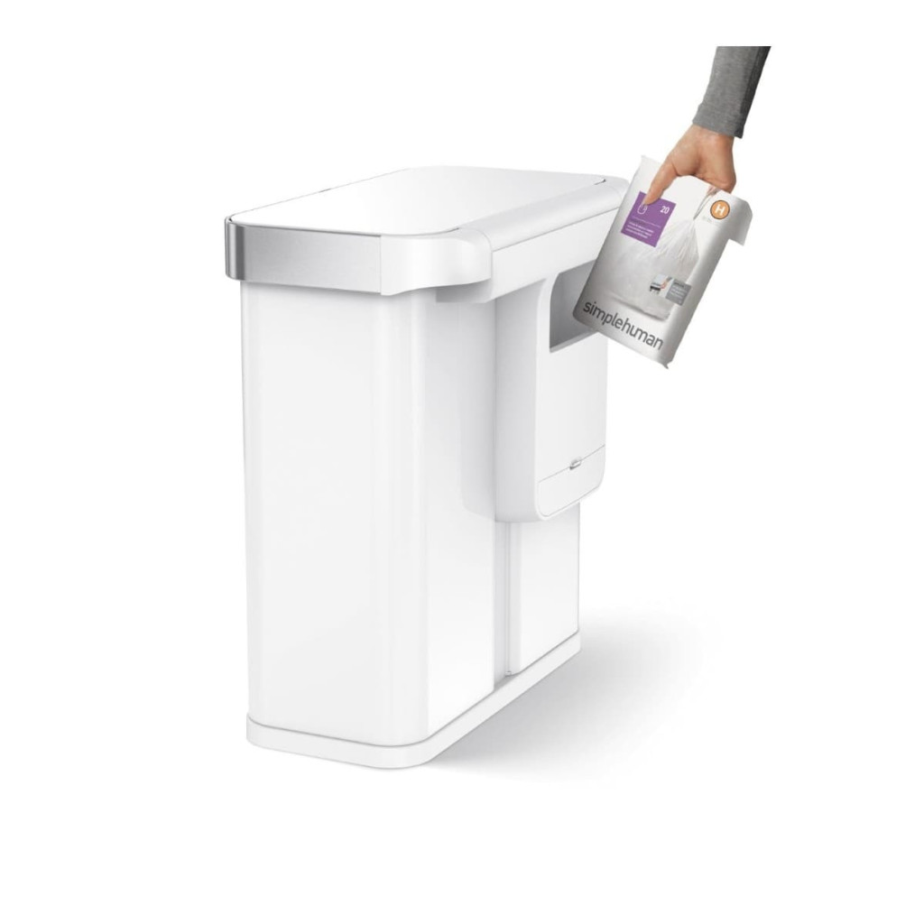 Simplehuman vyrábí pro jednotlivé modely košů dokonale padnoucí, extra silné pytle s dvojitými švy. Už nikdy žádné sklouznutí, prosakování nebo roztržení! Sáčky, které přesně padnou do tohoto koše, najdete pod písmenem „H“(30-35 L), které je skryté také pod víkem koše.