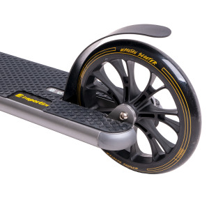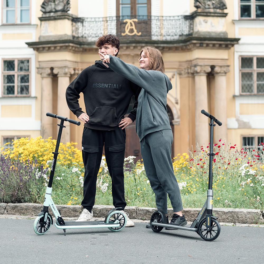 Koloběžka navíc disponuje zadní nášlapnou brzdou z odolného hliníku a v kombinaci s praktickým stojánkem doplňuje celý komplet jednoduchého elegantního designu, který určitě potěší každého vášnivého koloběžkáře.