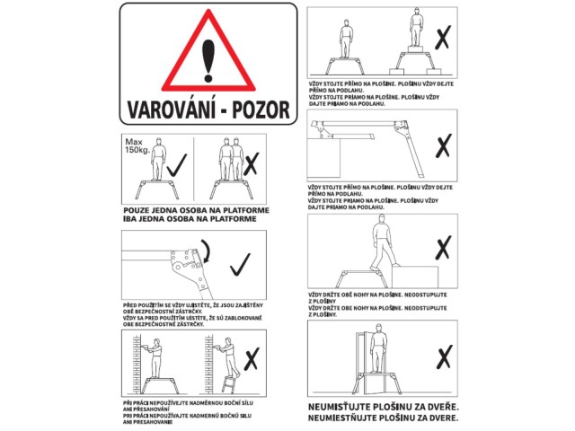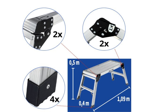 rozměr plošiny: 70x30cm, rozměr rozloženo: 107x40x50cm, max. zatížení: 150Kg, bezpečnostní aretace na obou patkách, protiskluzový profil, Záruka ASIST 3 roky.