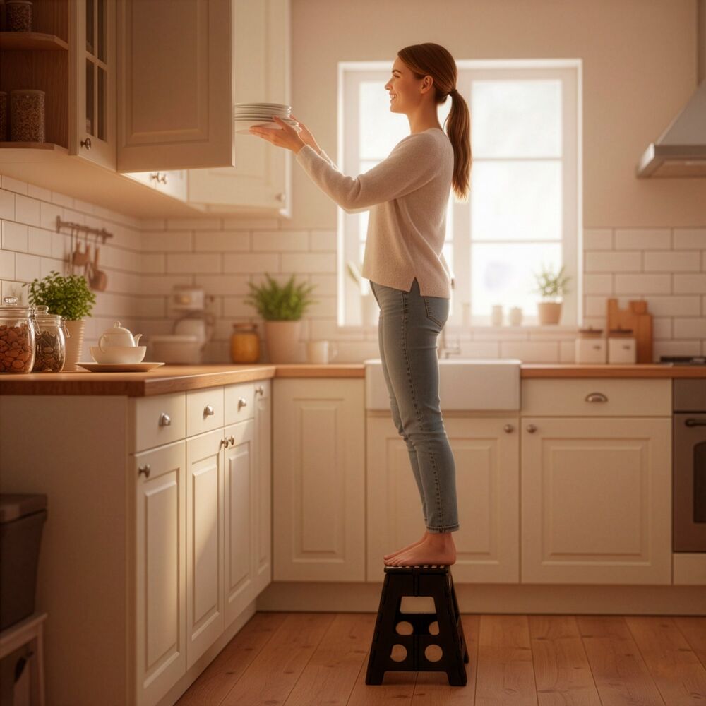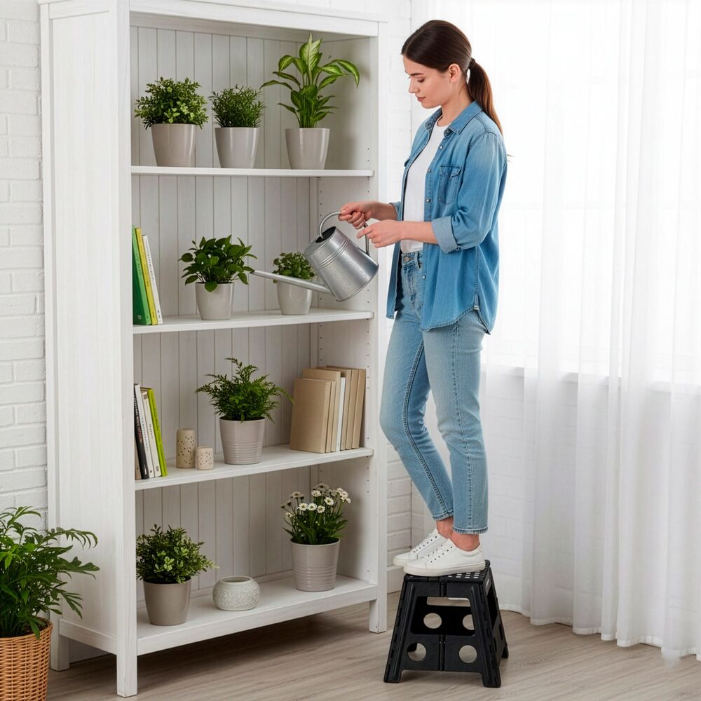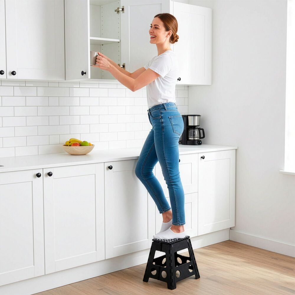 Velkou výhodou je skládací provedení, které umožňuje stoličku během okamžiku složit do tenkého tvaru. Integrované madlo usnadňuje přenášení a manipulaci, ať už doma nebo venku. Díky univerzálnímu využití poslouží jako praktické sedátko, stupínek nebo pomocník při dosahování do vyšších míst.
