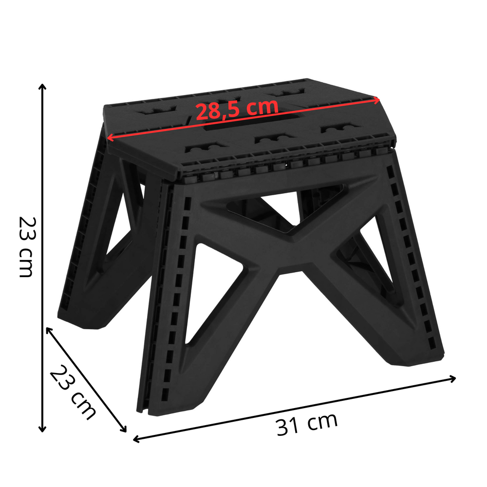Skládací židlička nabízí praktické řešení pro domácnost i venkovní použití. Lze ji složit naplocho a po složení má madlo pro snadné přenášení. Nosnost dosahuje 100 kg. Je vyrobena z pevného materiálu odolného vůči vlhkosti, snadno se čistí a je velmi lehká. Hodí se jako plošina pro vysoká místa, v koupelně i ve sprše. Snadno se skládá a vejde do úložného prostoru i kufru auta. Využijete ji v kuchyni, garáži, dílně i ve stanu.