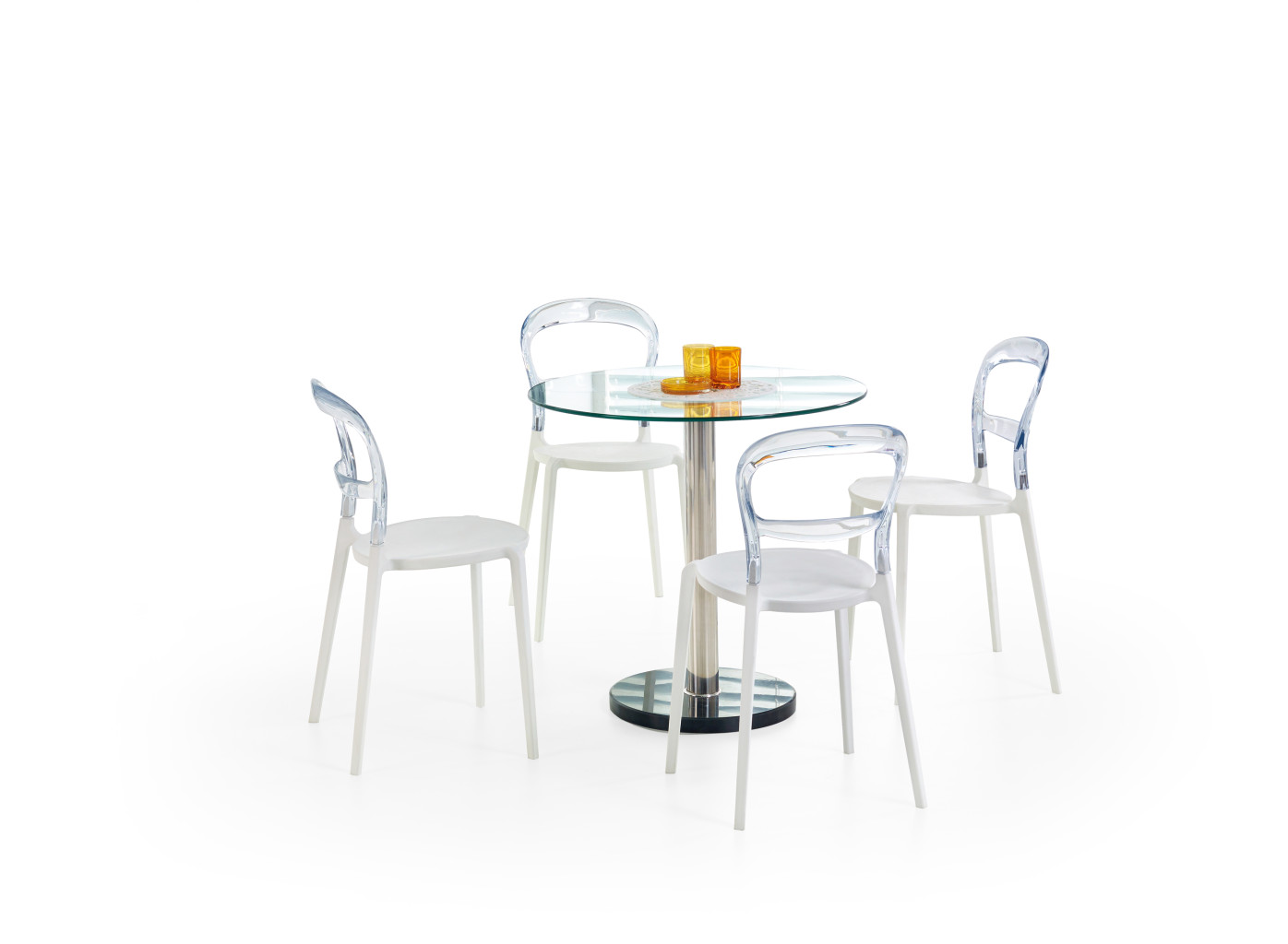 Kulatý skleněný jídelní stůl Cyryl s čirým sklem, s konstrukcí z chromované oceli a s podstavcem z mramoru..