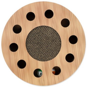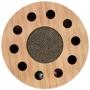 Dotaz na produktInteraktivní kartonové škrabadlo pro kočky se šantou, barevné provedení ve vzoru dub.