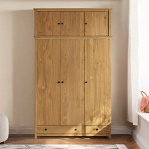 Dotaz na produkt Na splátky ještě dnesmateriál masiv borovice voskovaná v medovém odstínu kovové úchytky v barevném provedení černěná mosaz prostor dělený v poměru 2:1 širší část šatní tyč a police, užší část 3 police ve spodní části 2 zásuvky s kovovými pojezdy doporučený nástavec 8189V