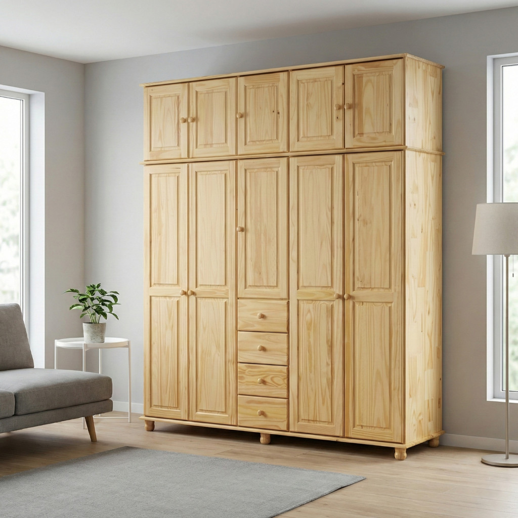 materiál masiv borovice, lakované provedení čtyři zásuvky s kovovými pojezdy v levé části dvě šatní tyče, ve střední části 1 police a v pravé části 3 police doporučený nástavec 8855