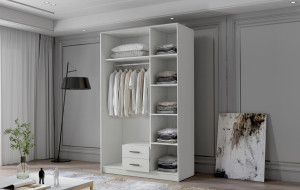 Dotaz na produkt Na splátky ještě dnesŠatní skříň Arya I v moderním designu má šířku 120 cm a je rozdělena na dvě praktické části. Vnitřní uspořádání kombinuje závěsnou tyč, pět polic a 2 šuplíky, což umožňuje přehledné a praktické rozdělení šatníku.