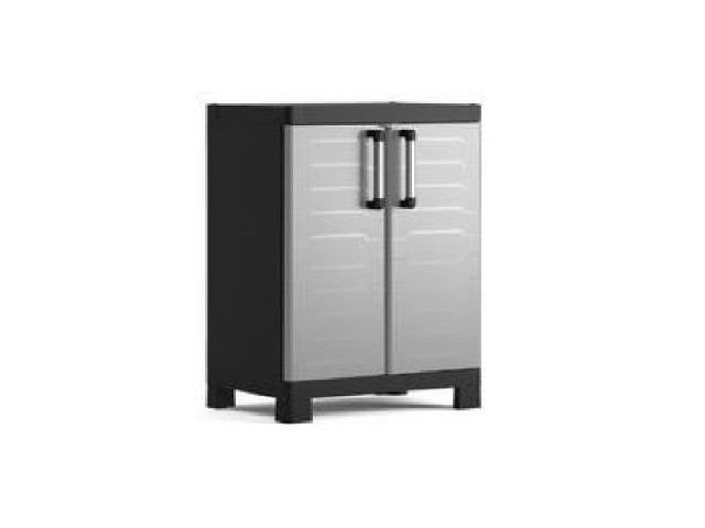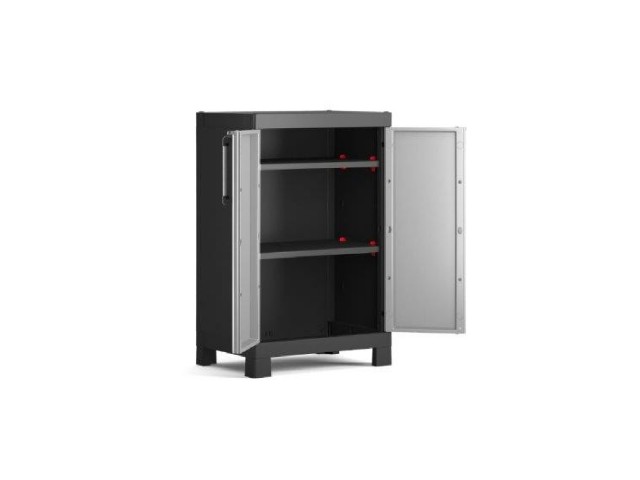 Skříň se 2 nastavitelnými policemi o nosnosti 15 kg, stabilitu zajišťují pevné nožičky, možnost dodatečného uzamčení, vyrobena z propylenu velmi odolného proti chladu a nepříznivému počasí, olejům a rozpouštědlům, zvýšená odolnost proti nárazům, ideální do sklepa, garáže, dílny, na balkon, terasu či do chodby, rozměry skříně 65 x 45 x 97 cm, šedá/černá