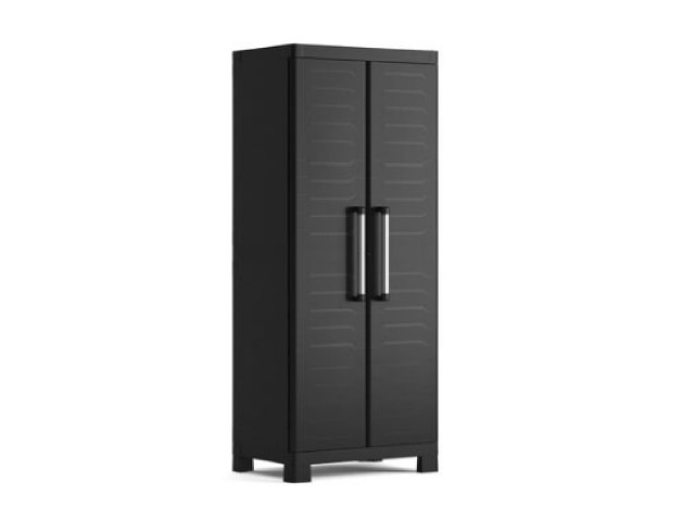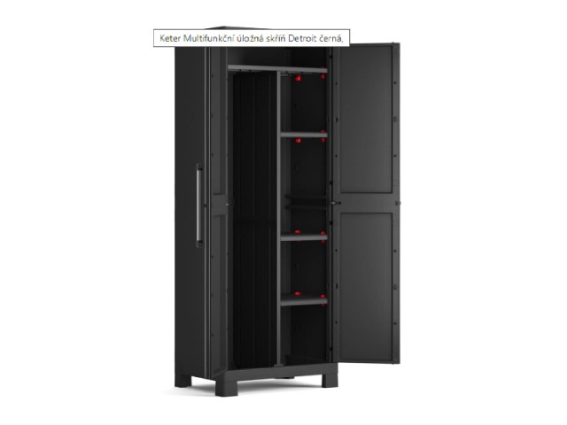Skříň dělená se 4 nastavitelnými policemi o nosnosti 15 kg, stabilitu zajišťují pevné nožičky, možnost dodatečného uzamčení, vyrobena z propylenu velmi odolného proti chladu a nepříznivému počasí, olejům a rozpouštědlům, zvýšená odolnost proti nárazům, ideální do sklepa, garáže, dílny, na balkon, terasu či do chodby, rozměry skříně 65 x 45 x 182 cm, černá
