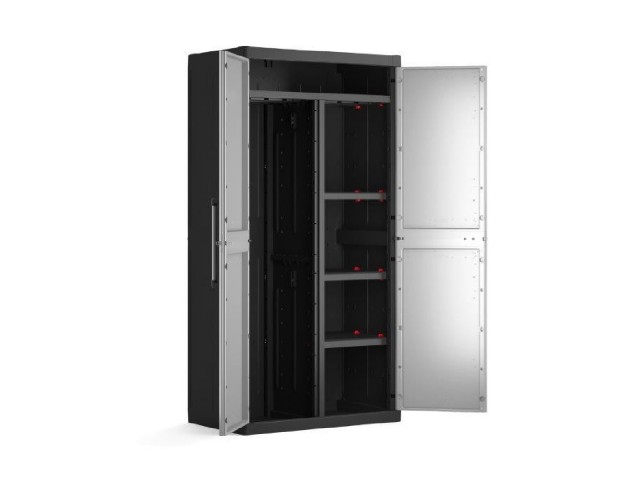 Skříň dělená se 4 policemi o nosnosti 15 kg, možnost dodatečného uzamčení, vyrobena z propylenu velmi odolného protichladu a nepříznivému počasí, olejům a rozpouštědlům, zvýšená odolnost proti nárazům, ideální do sklepa, garáže, dílny, na balkon, terasu či do chodby, rozměry skříně 89 x 54 x 182 cm, šedá/černá