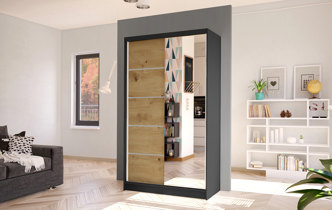 Šatní skříň Diem III v moderním designu má šířku 100 cm a je rozdělena na dvě praktické části. Posuvné dveře šetří místo a usnadňují přístup do interiéru. Vnitřní uspořádání kombinuje závěsnou tyč a čtyři police, což umožňuje přehledné a praktické rozdělení šatníku.