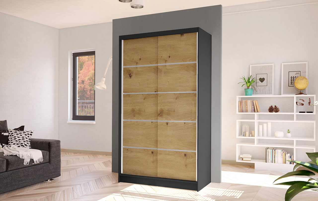Korpus i dveře jsou vyrobeny z odolné 16 mm laminované desky s ABS hranami, které zajišťují dlouhou životnost. Posuvné dveře se hladce pohybují po hliníkových vodicích lištách. Skříň je dostupná v několika atraktivních barevných provedeních, takže ji snadno sladíte s ostatním nábytkem.