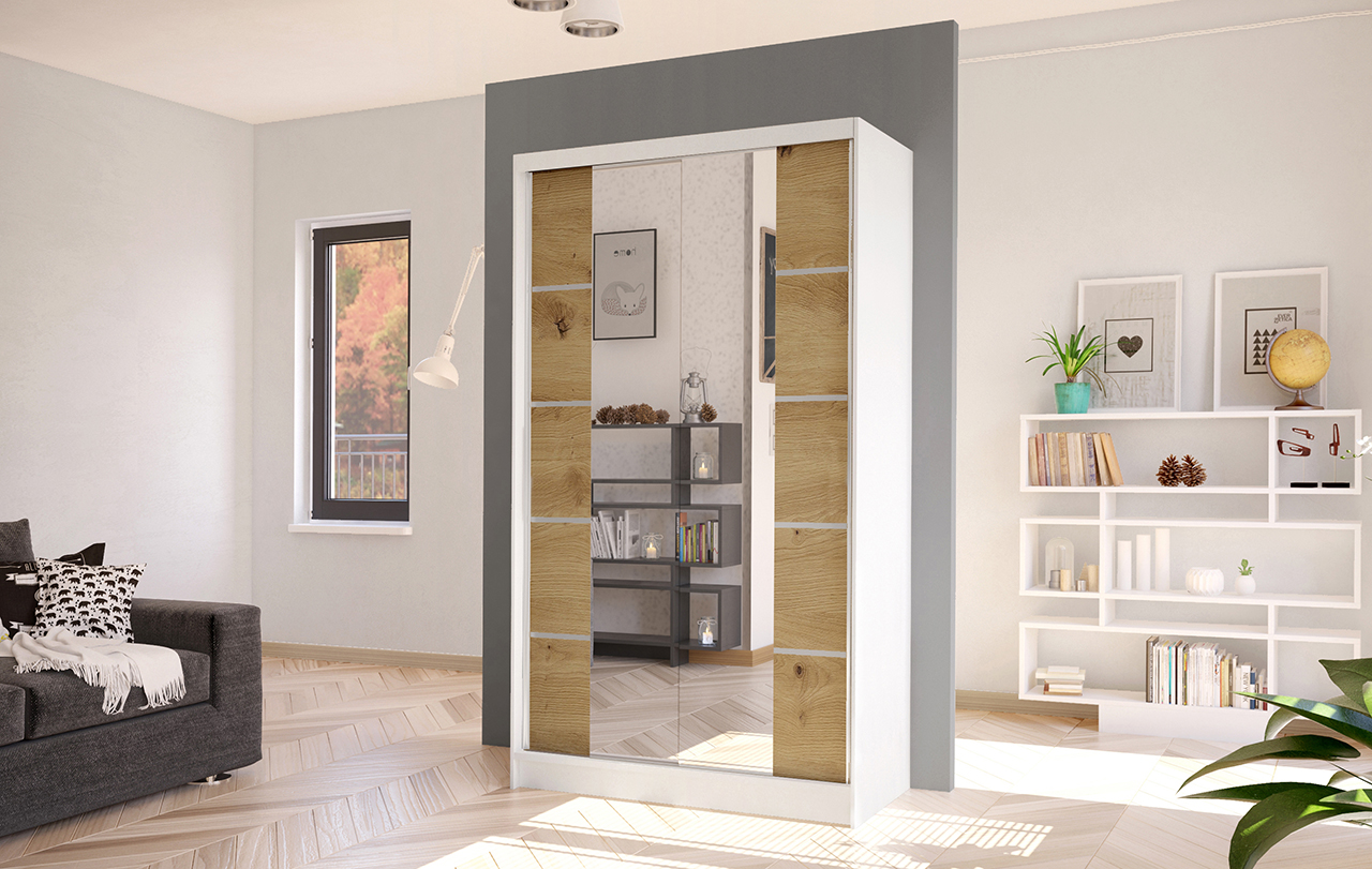 Šatní skříň Diem V v moderním designu má šířku 100 cm a je rozdělena na dvě praktické části. Posuvné dveře šetří místo a usnadňují přístup do interiéru. Vnitřní uspořádání kombinuje závěsnou tyč a čtyři police, což umožňuje přehledné a praktické rozdělení šatníku.