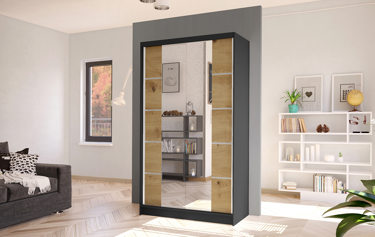 Šatní skříň Diem V v moderním designu má šířku 100 cm a je rozdělena na dvě praktické části. Posuvné dveře šetří místo a usnadňují přístup do interiéru. Vnitřní uspořádání kombinuje závěsnou tyč a čtyři police, což umožňuje přehledné a praktické rozdělení šatníku.