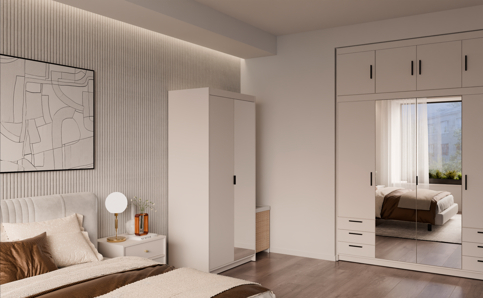 ÚvodNábytekSkříně a komodyŠatní skříněSkříň Enja 2D/1 zrcadlo písková béžová
