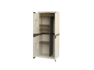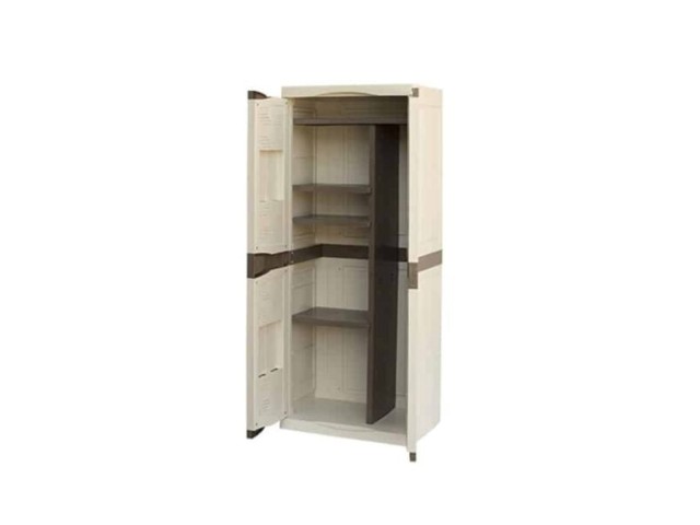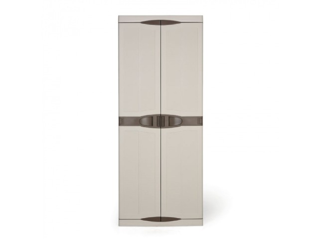 Skříň dělená se 4 policemi o nosnosti 25 kg, možnost dodatečného uzamčení, vyrobena z propylenu velmi odolného protichladu a nepříznivému počasí, olejům a rozpouštědlům, zvýšená odolnost proti nárazům, ideální do sklepa, garáže, dílny, na balkon, terasu či do chodby, rozměry skříně 70 x 47 x 184 cm, béžová/hnědá.