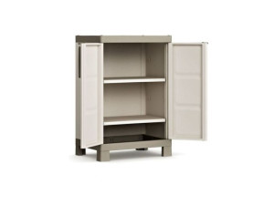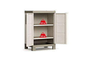 Multifunkční úložná skříň EXCELLENCE vysoká dělená, 2 nastavitelné police s nosností až 15 kg, uzamykatelný systém (zámek není součástí balení), zvýšené nožičky pro snadné čištění podlah, rozměry: 65 x 45 x 97 cm (š x h x v).