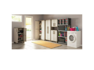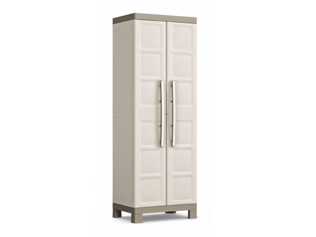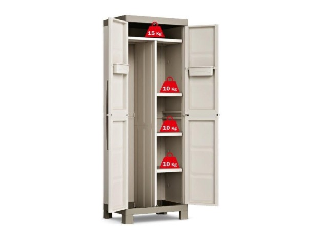 Multifunkční úložná skříň EXCELLENCE vysoká dělená, 3 nastavitelné police s nosností až 10 kg, uzamykatelný systém (zámek není součástí balení), zvýšené nožičky pro snadné čištění podlah, rozměry: 65 x 45 x 181 cm (š x h x v).