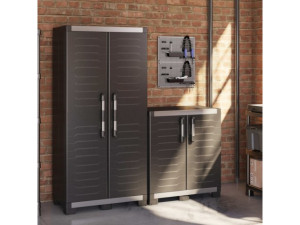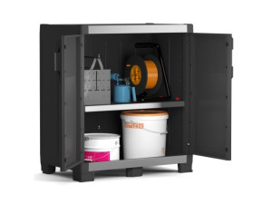 Úložná skříň GARAGE XL, nízká je perfektním řešením pro každé prostředí, vyrobena ze 100% recyklovatelného plastu odolného proti UV záření a přírodním vlivům, obsahuje 1 nastavitelnou polici, bezpečnost zajištěna uzamykatelnými dveřmi s robustní rukojetí, rozměry: 89 x 54 x 99 cm (š x h x v).