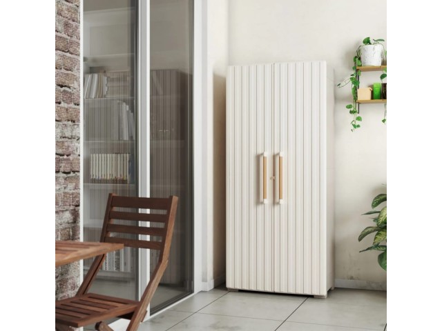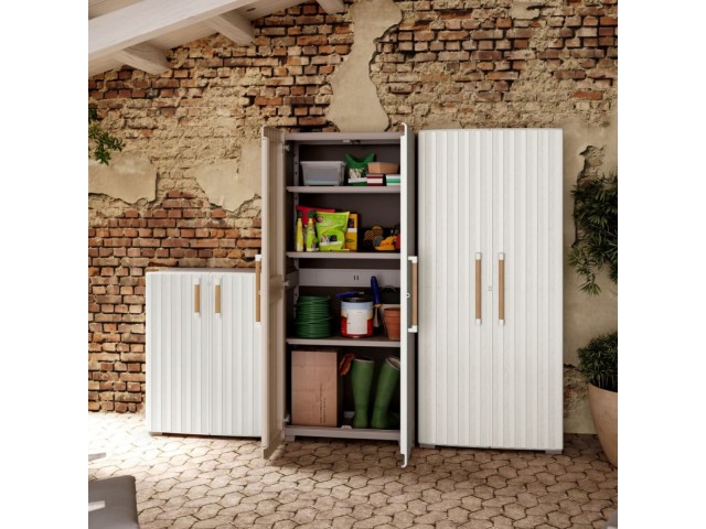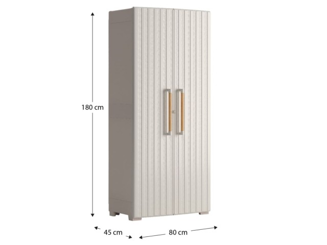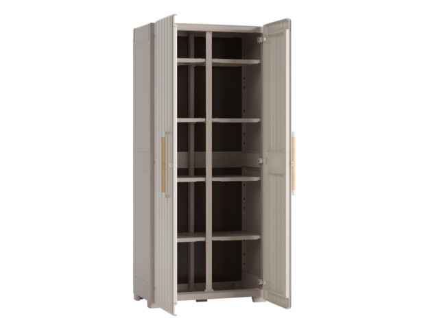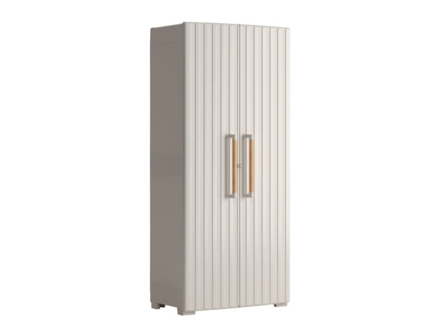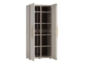 Úložná skříň GROOVE vysoká, vyrobená z recyklovaného plastu, vodotěsná, 8 nastavitelných polic s nosností 15 kg, uzamkytalené dveře (zámek není součástí balení), kovové závěsy pro široké otevření dveří, elegantní dřevěné úchyty, čtyři nastavitelné nohy a pevné vyztužené dno, rozměry: 80 x 45 x 180 cm (š x h x v).