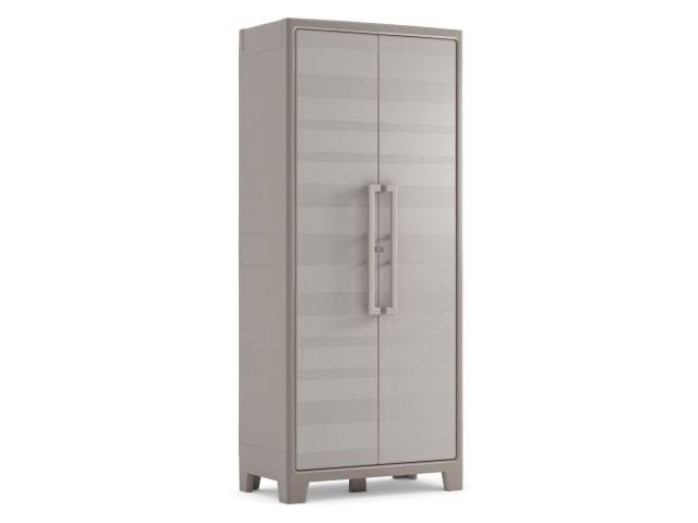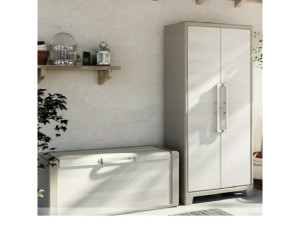 Skříň dělená s 8 policemi o nosnosti 15 kg, stabilitu zajišťuje 5 nastavitelných nožiček, možnost dodatečného uzamčení, robustní kovové panty, vyrobena z propylenu velmi odolného protichladu a nepříznivému počasí, olejům a rozpouštědlům, zvýšená odolnost proti nárazům, ideální do sklepa, garáže, dílny, na balkon, terasu či do chodby, rozměry skříně 80 x 44 x 182 cm, béžová/bílá