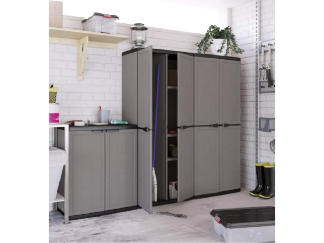 Skříň z naší nabídky je rozdělena na dvě samostatně otvíratelné části. Uvnitř je první polovina vybavena 3 variabilními policemi a druhá slouží pro úschovu košťat. Vyrobena je z pevného a odolného plastu. Dvířka jsou opatřena drobnými úchyty, díky kterým se snadno otevírají.